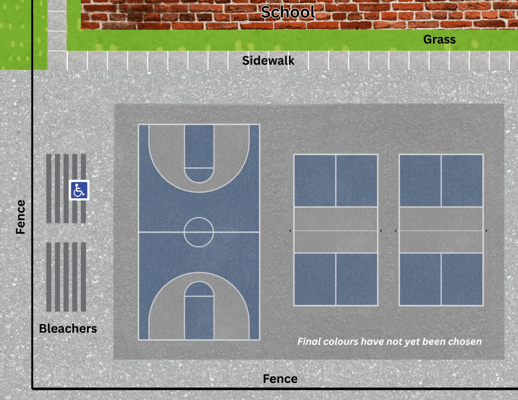 Phase 2 will include repurposing part of the old tennis court space to the north of the school to include a custom sized 50′ x 64′ basketball court, complete with two regulation sized three point lines and accessible bleacher seating.