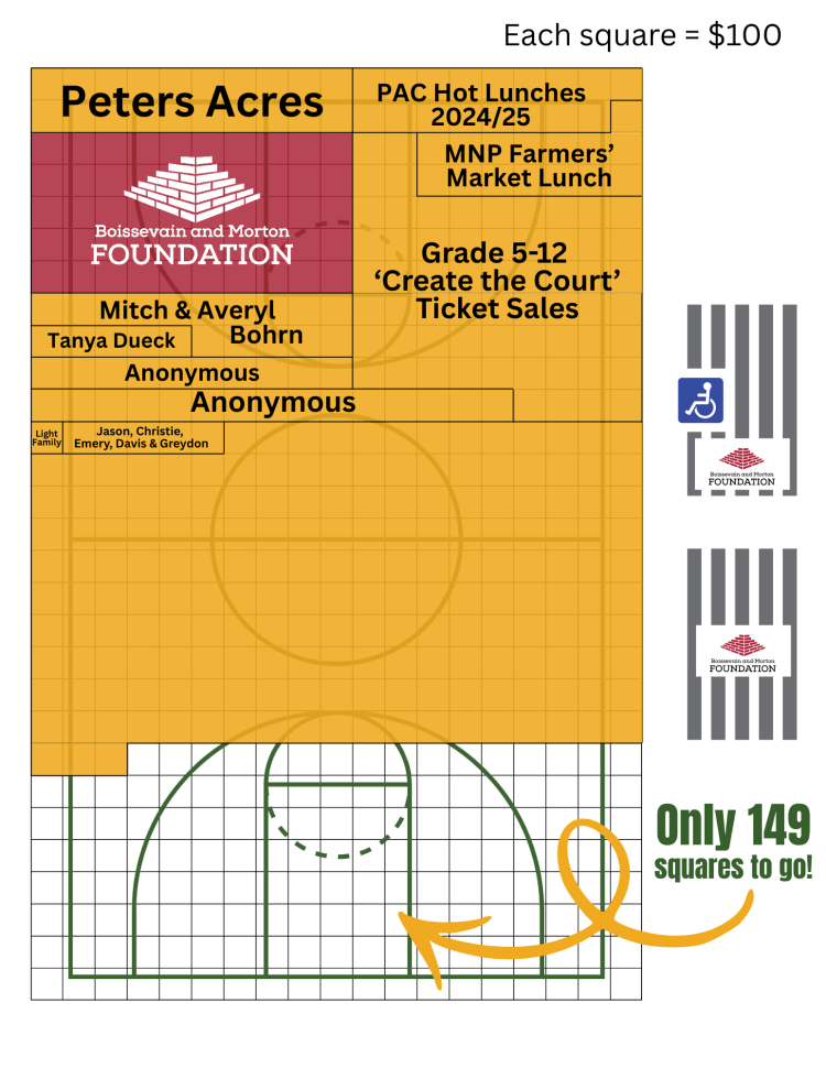 We will be applying for grants, and students will be fundraising throughout the 2025/26 school year to build the court during summer 2026. This accessible court will be a welcome addition to our community, offering a space for our youth and adults to enjoy shooting some hoops together or practice their jump shot on their own. Approximate cost of resurfacing the court is $55,100. You can help us ‘Create The Court’ by making a donation to help cover the cost of one or numerous of the 551 squares, valued at $100 each.