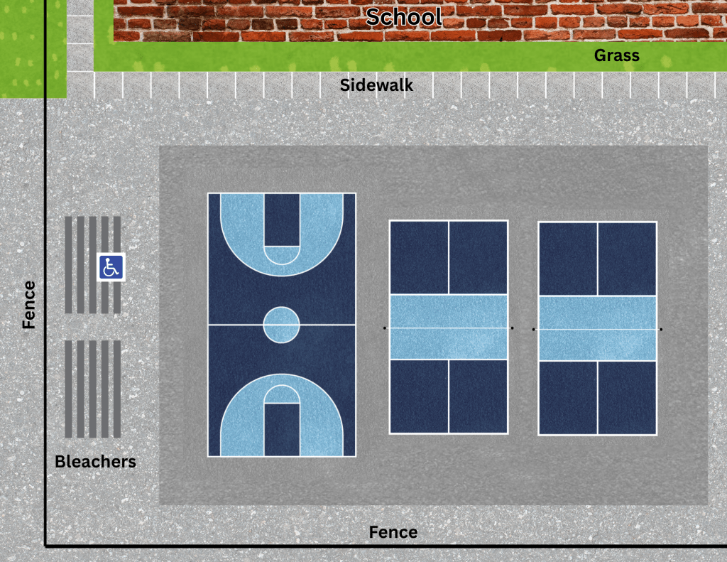 Phase 2 will include repurposing part of the old tennis court space to the north of the school to create a multi-sport court for our community. This space will include two pickleball courts along with a custom sized 50′ x 64′ basketball court, complete with two regulation sized three point lines and accessible bleacher seating.